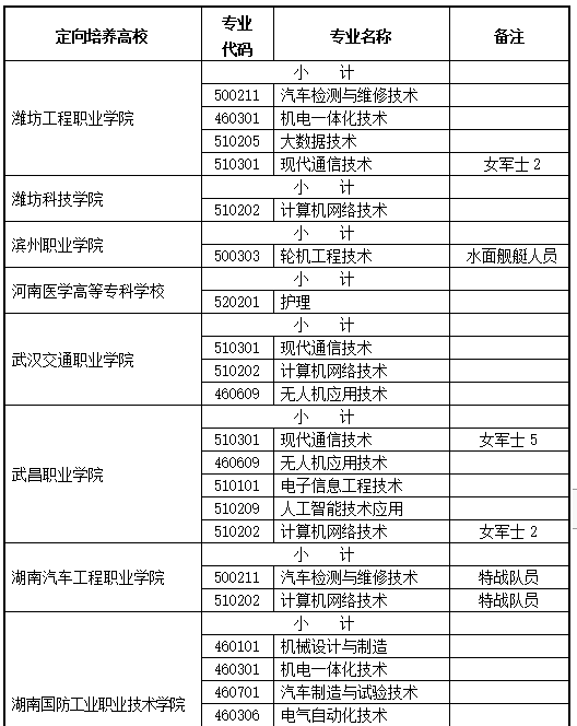 報(bào)考定向培養(yǎng)軍士的考生,應(yīng)當(dāng)參加2023年普通高等學(xué)校招生全國(guó)統(tǒng)一考試,未婚,年齡不超過20周歲(2003年8月31日以后出生),志愿至少服現(xiàn)役滿5年,其政治和身體條件按照征集義務(wù)兵的規(guī)定執(zhí)行。二、招生計(jì)劃