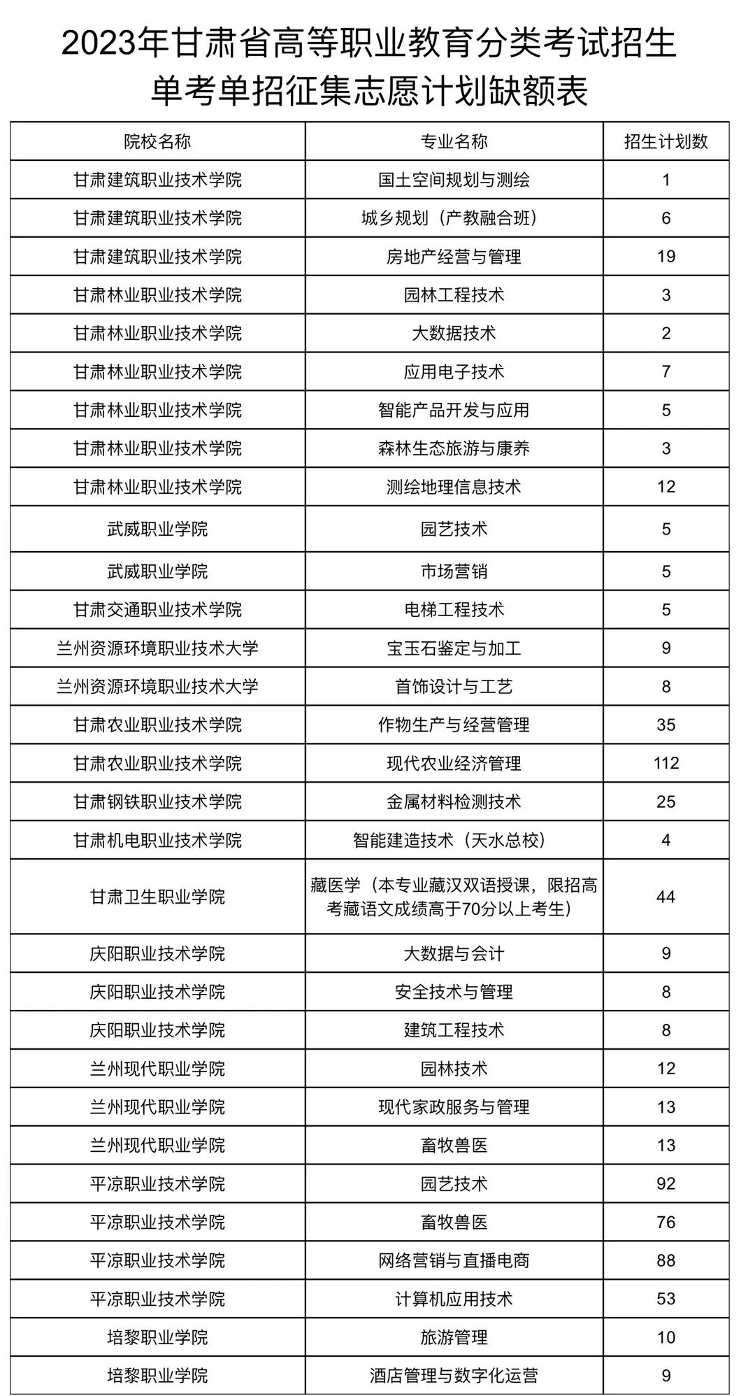 附件:2023年甘肅省高等職業(yè)教育分類考試招生單考單招征集志愿計劃缺額表