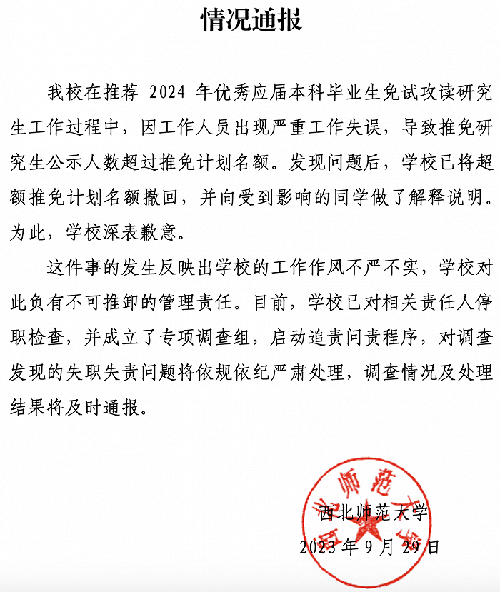西北師范大學(xué)官網(wǎng)9月29日發(fā)布情況通報(bào):