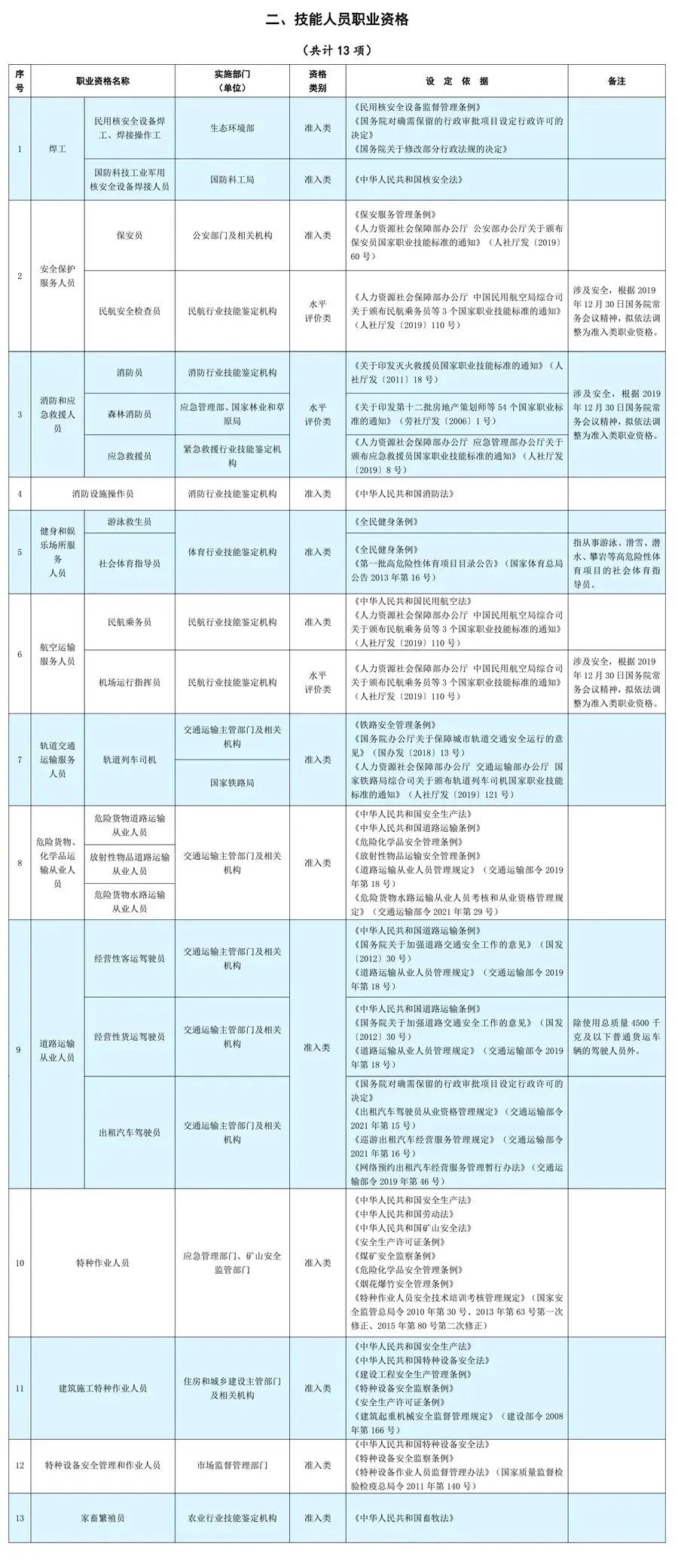 按照國(guó)家職業(yè)資格目錄,準(zhǔn)入類專業(yè)技術(shù)人員職業(yè)資格有33項(xiàng),準(zhǔn)入類技能人員職業(yè)資格有13項(xiàng)。