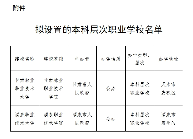 以甘肅林業(yè)職業(yè)技術(shù)學(xué)院為基礎(chǔ)設(shè)置甘肅林業(yè)職業(yè)技術(shù)大學(xué)、以酒泉職業(yè)技術(shù)學(xué)院為基礎(chǔ)設(shè)置酒泉職業(yè)技術(shù)大學(xué)