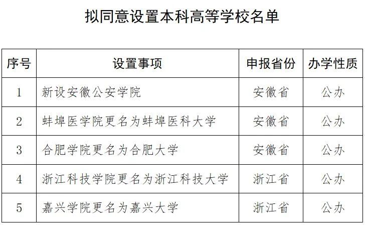 近日,教育部網(wǎng)站顯示,根據(jù)《中華人民共和國高等教育法》《普通高等學校設置暫行條例》《普通本科學校設置暫行規(guī)定》有關(guān)規(guī)定以及第八屆全國高等學校設置評議委員會考察評議結(jié)果,經(jīng)教育部黨組會議審議,擬同意新設安徽公安學院、蚌埠醫(yī)學院更名為蚌埠醫(yī)科大學、合肥學院更名為合肥大學、浙江科技學院更名為浙江科技大學、嘉興學院更名為嘉興大學。