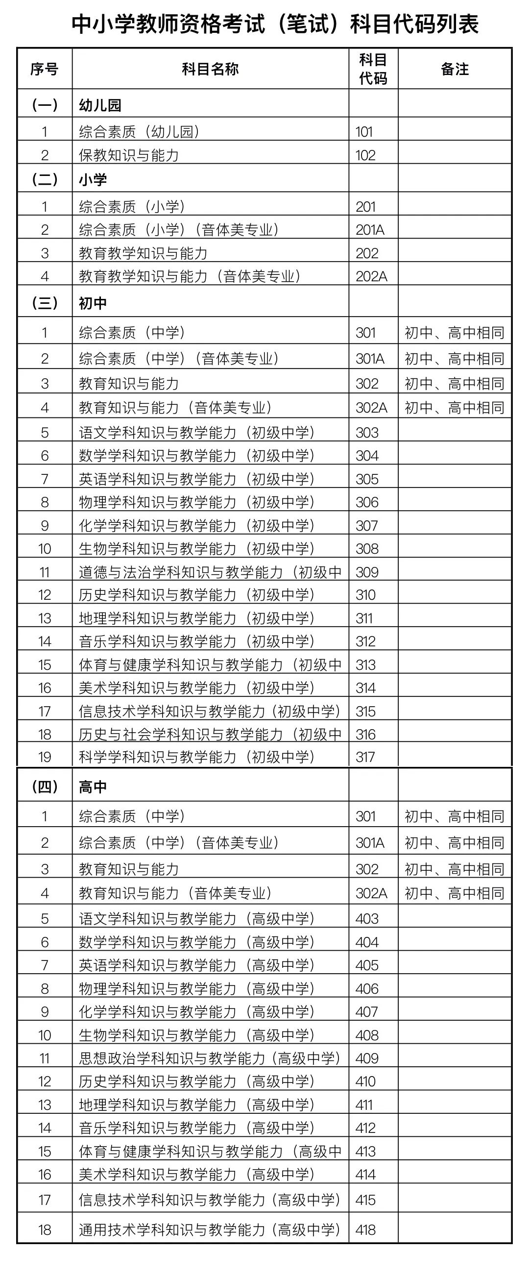 (二)根據(jù)教育部文件精神,報考小學、初級中學、普通高級中學、中職文化課類別音、體、美專業(yè)的考生,筆試科目一和科目二的代碼為201A、202A、301A、302A,考試內容暫與原科目相同。上述考生在筆試報名時應選報科目代碼含“A”的科目。取得201A、202A科目合格的考生,面試僅限于參加小學類別音、體、美專業(yè)科目;取得301A、302A科目合格的考生,面試僅限于參加初中、高中、中職文化課類別音、體、美專業(yè)科目。考生獲得201、202、301、302科目合格成績,可相應替代201A、202A、301A、302A科目合格成績;考生獲得201A、202A、301A、302A科目合格成績不可替代201、202、301、302科目合格成績。