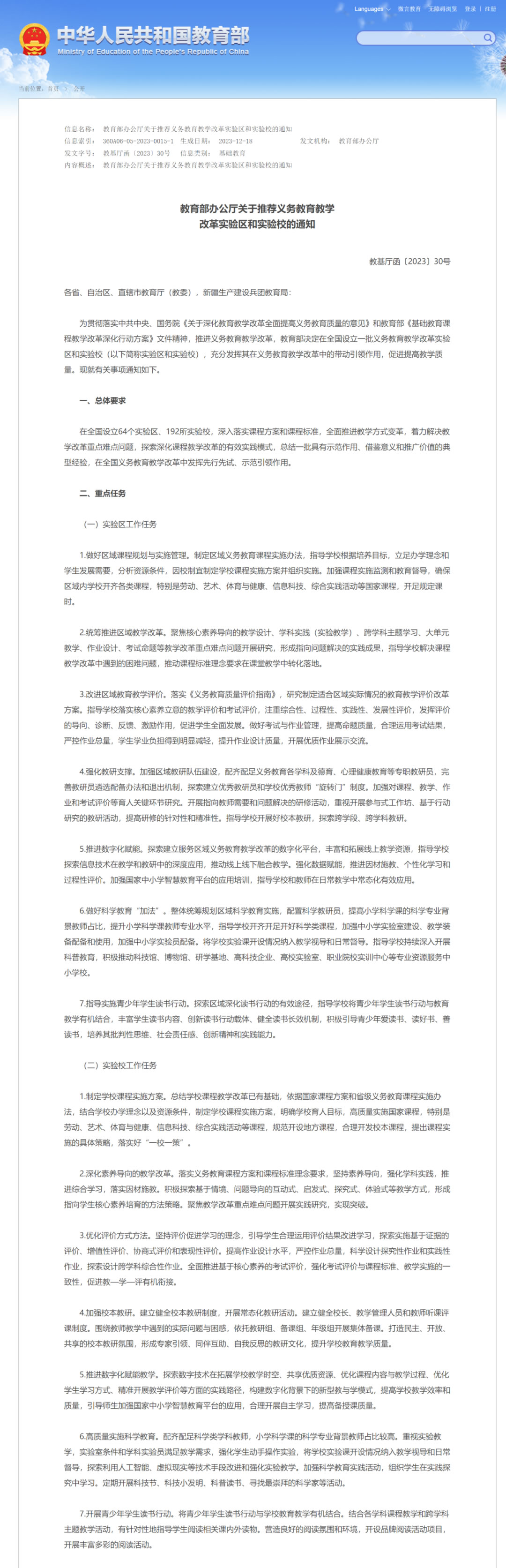 近日,教育部辦公廳印發(fā)關(guān)于推薦義務(wù)教育教學改革實驗區(qū)和實驗校的通知,決定在全國設(shè)立一批義務(wù)教育教學改革實驗區(qū)和實驗校,并公示了義務(wù)教育教學改革實驗區(qū)和實驗校名單。