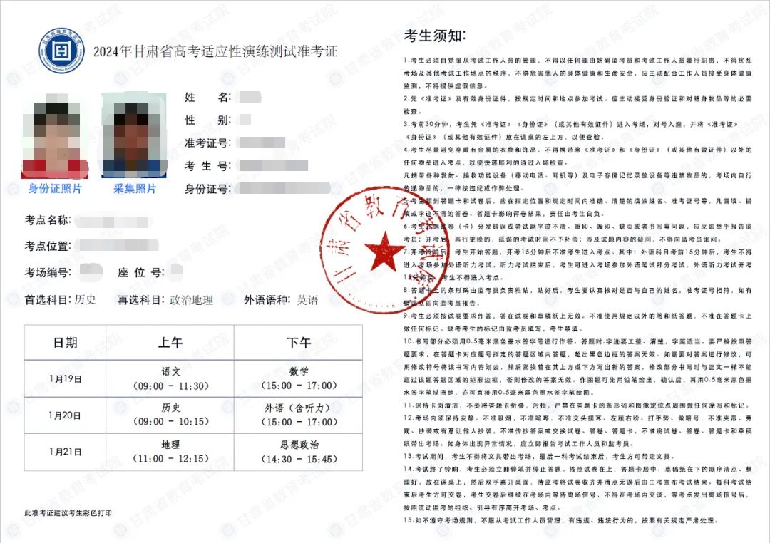 2024年甘肅省高考適應性演練測試準考證于1月14日開始打印。請所有參加本次適應性演練測試的考生在考前登陸甘肅省國家教育考試綜合管理平臺考生服務平臺https://kw.ganseea.cn/login,點擊“準考證打印”,即可下載準考證。下載途徑以及準考證示例如下: