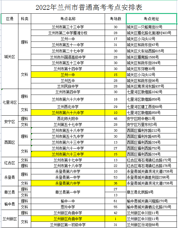 蘭州市2022年普通高考考點(diǎn)安排分別為: