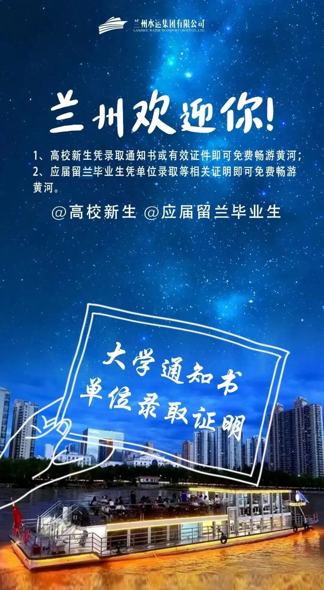 蘭州水運集團(tuán)8月31日發(fā)布,為積極響應(yīng)蘭州文化和旅游局的政策,9月1日至9月30日,高校新生(含大專院校、本科及研究生)憑大學(xué)錄取通知書及本人有效身份證件,就能免費乘坐游船暢游黃河。另外,應(yīng)屆畢業(yè)生(含大專院校、本科及研究生)留蘭工作憑單位錄取相關(guān)證明也能免費乘坐游船暢游黃河。
