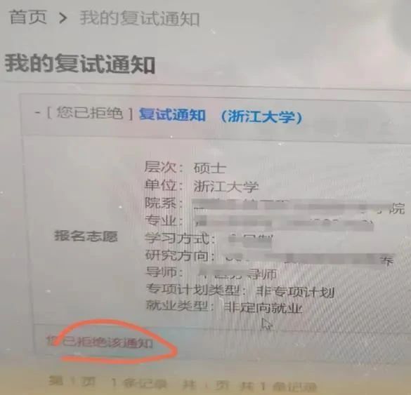 據(jù)報道,四川廣安一名大學生此前已經(jīng)通過了浙大的保研復試考核。她登陸研究生招生信息網(wǎng)收到了浙江大學的保研復試通知,結果由于情緒激動,而通知頁面上的“拒絕”選項在“接受”之前,這名同學錯點了“拒絕”。好在她及時聯(lián)系學院招生老師,溝通后重新提交了志愿,最終被順利錄取。該話題隨后沖上熱搜。