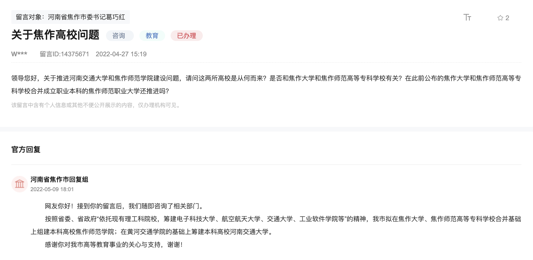 2022年5月,河南省焦作市回復(fù)組在人民網(wǎng)領(lǐng)導(dǎo)留言板回復(fù)時提到,我市擬在焦作大學(xué)、焦作師范高等??茖W(xué)校合并基礎(chǔ)上組建本科高校焦作師范學(xué)院。