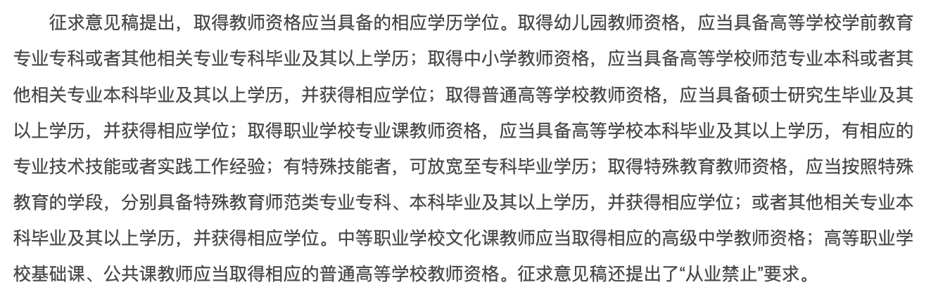 2021年11月,教育部針對《中華人民共和國教師法(修訂草案)》公開征求意見,其中提出,取得中小學(xué)教師資格,應(yīng)當(dāng)具備高等學(xué)校師范專業(yè)本科或者其他相關(guān)專業(yè)本科畢業(yè)及其以上學(xué)歷,并獲得相應(yīng)學(xué)位。
