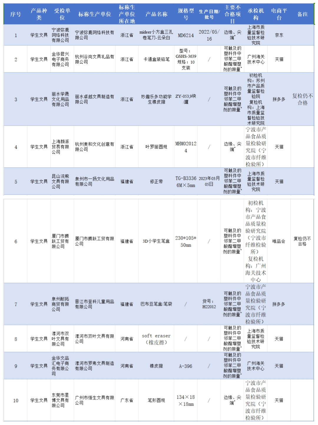 1. 標(biāo)稱寧波彌鹿網(wǎng)絡(luò)科技有限公司生產(chǎn)的mideer小方盒三孔卷筆刀-云朵白,規(guī)格型號:MD6214,主要不合格項目:邊緣、尖端;2. 標(biāo)稱杭州谷尚文具禮品有限公司生產(chǎn)的生產(chǎn)的卡通盒裝鉛筆,型號:GSHS-3639,主要不合格項目:可觸及的塑料件中鄰苯二甲酸酯增塑劑的限量;3. 標(biāo)稱麗水卓越文具制造有限公司生產(chǎn)的妙趣樂多功能學(xué)生橡皮擦,型號:ZY-053,主要不合格項目:可觸及的塑料件中鄰苯二甲酸酯增塑劑的限量,備注:復(fù)檢仍不合格;4. 標(biāo)稱杭州麥和文化創(chuàng)意有限公司生產(chǎn)的葉羅麗圓規(guī),規(guī)格型號:MHM020124,主要不合格項目:邊緣、尖端;5. 標(biāo)稱泉州市一揚文化用品有限公司生產(chǎn)的修正帶,規(guī)格型號:TG-B3336 6M×5mm,主要不合格項目:可觸及的塑料件中鄰苯二甲酸酯增塑劑的限量;6. 標(biāo)稱廈門市騰躍工貿(mào)有限公司生產(chǎn)的3D小學(xué)生筆盒,規(guī)格型號:230*105*50mm,主要不合格項目:可觸及的塑料件中鄰苯二甲酸酯增塑劑的限量,備注:復(fù)檢仍不合格;7. 標(biāo)稱晉江市登科兒童用品有限公司生產(chǎn)的巴布豆筆盒/筆袋,貨號:H22012,主要不合格項目:可觸及的塑料件中鄰苯二甲酸酯增塑劑的限量;8. 標(biāo)稱漯河市雙葉文具有限公司生產(chǎn)的soft eraser(橡皮擦),主要不合格項目:可觸及的塑料件中鄰苯二甲酸酯增塑劑的限量;9. 標(biāo)稱漯河市羅弗文具制造有限公司生產(chǎn)的橡皮擦,規(guī)格型號:A-396,主要不合格項目:可觸及的塑料件中鄰苯二甲酸酯增塑劑的限量;10. 標(biāo)稱廣州市悟生文具有限公司生產(chǎn)的筆形圓規(guī),規(guī)格型號:134×18×18mm,主要不合格項目:邊緣、尖端。