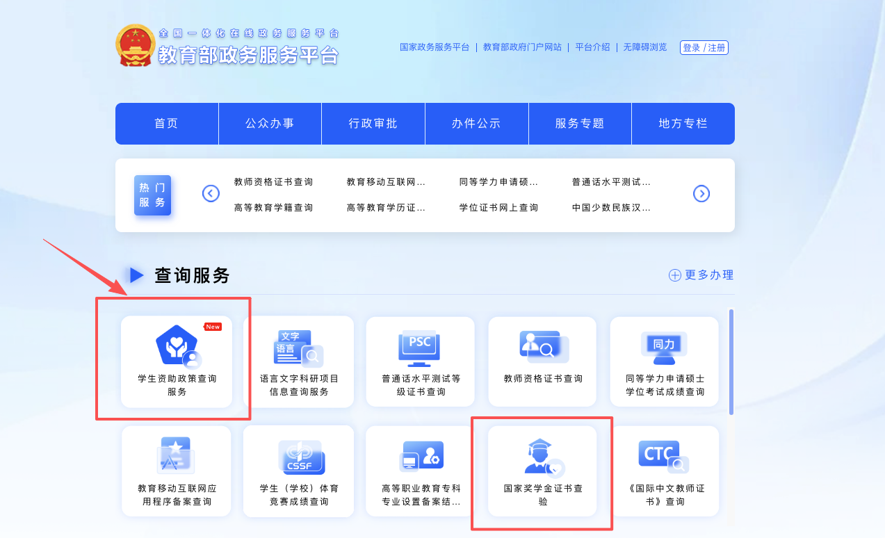 1.訪問(wèn)教育部政務(wù)服務(wù)平臺(tái)(https://zwfw.moe.gov.cn/,即教育部官方網(wǎng)站服務(wù)板塊),在“查詢服務(wù)”板塊,選擇使用“學(xué)生資助政策查詢服務(wù)”;