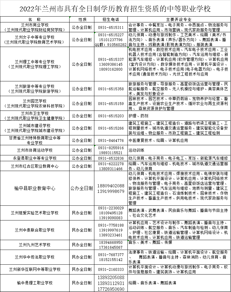 蘭州市現(xiàn)有中等職業(yè)學校18所,在校生1.6萬人,教職工1400余人,其中“雙師型”教師579人,專業(yè)分布點137個,2022年蘭州市具有全日制學歷教育招生資質(zhì)中等職業(yè)學?;厩闆r如下: