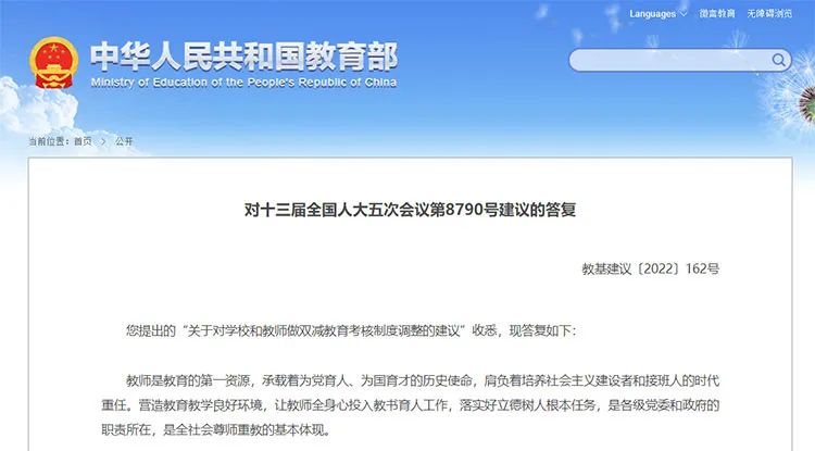 近日,教育部網(wǎng)站發(fā)布“關(guān)于對學(xué)校和教師做雙減教育考核制度調(diào)整的建議”的答復(fù)。答復(fù)中提到,教育部高度重視并采取多種措施,推動減輕教師負(fù)擔(dān)。