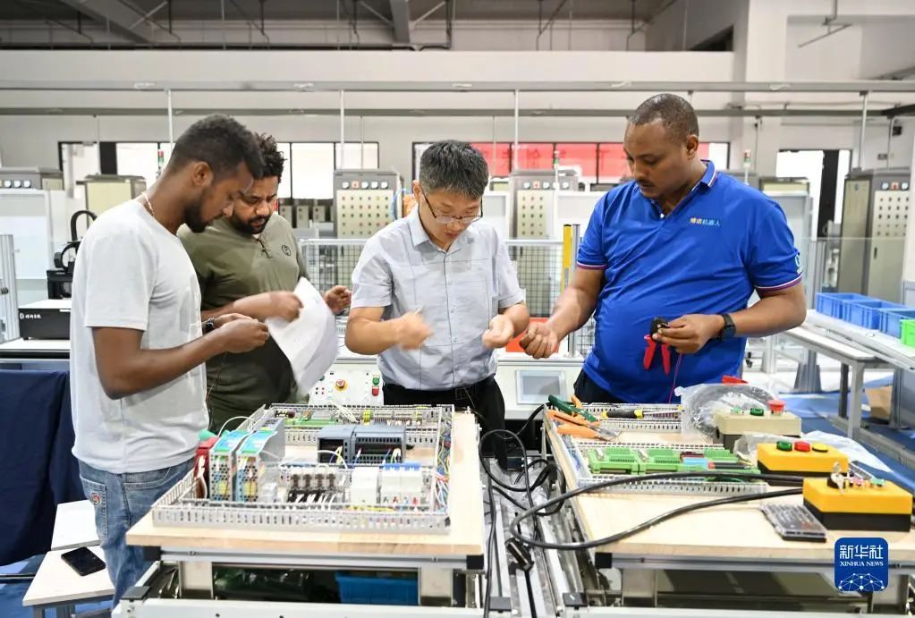 在天津職業(yè)技術(shù)師范大學(xué),老師帶領(lǐng)韓士蘭(右一)和其他留學(xué)生進(jìn)行實(shí)訓(xùn)操作(2022年7月29日攝)。今年38歲的韓士蘭來(lái)自埃塞俄比亞,3年前,他來(lái)到天津,在天津職業(yè)技術(shù)師范大學(xué)攻讀教育學(xué)博士。新華社記者 李然 攝