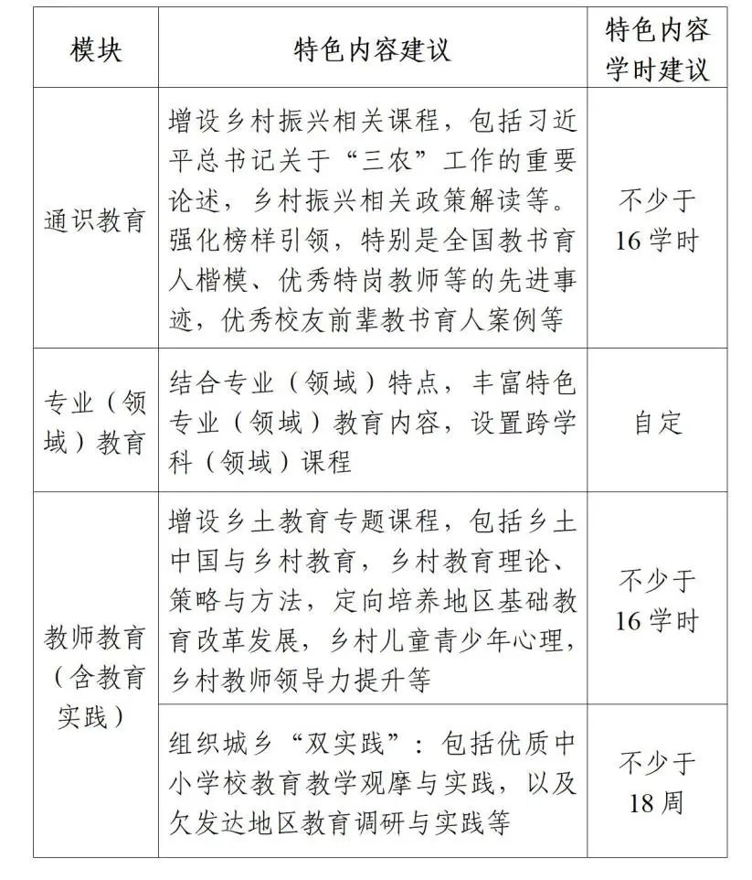 在合理設(shè)置通識(shí)教育、專業(yè)(領(lǐng)域)教育、教師教育(含教育實(shí)踐)課程結(jié)構(gòu)的基礎(chǔ)上,圍繞培養(yǎng)目標(biāo)和畢業(yè)要求,結(jié)合中西部欠發(fā)達(dá)地區(qū)教育實(shí)際,重點(diǎn)體現(xiàn)以下特色課程內(nèi)容。