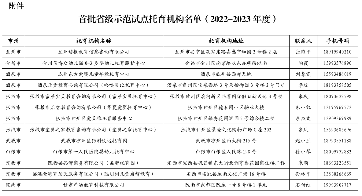 為深入貫徹落實國家和省上關(guān)于促進(jìn)托育服務(wù)健康發(fā)展的決策部署,充分發(fā)揮示范性托育機(jī)構(gòu)的輻射帶動作用,推動全省3歲以下嬰幼兒照護(hù)服務(wù)工作專業(yè)化、規(guī)范化發(fā)展,根據(jù)《關(guān)于創(chuàng)建省級示范試點托育機(jī)構(gòu)的通知》(甘衛(wèi)家庭函〔2021〕210?號)要求,經(jīng)托育機(jī)構(gòu)自評申報、市縣主管部門逐級審核推薦、委托第三方現(xiàn)場審核、省衛(wèi)生健康委審定并公示,決定命名蘭州培根教育信息咨詢有限公司等13所托育機(jī)構(gòu)為甘肅省首批省級示范試點托育機(jī)構(gòu)并授牌,示范周期為2022-2023年度。