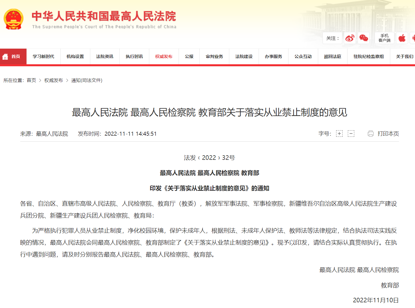 11月11日,最高人民法院會同最高人民檢察院、教育部發(fā)布《關于落實從業(yè)禁止制度的意見》(以下簡稱《意見》)。《意見》按照最有利于未成年人的原則,就依法嚴格執(zhí)行犯罪人員從業(yè)禁止制度,進一步加強司法保護與學校保護、社會保護的銜接作出了規(guī)定,旨在為凈化校園環(huán)境、加強師德師風建設,切實保護未成年人提供強有力的司法保障。