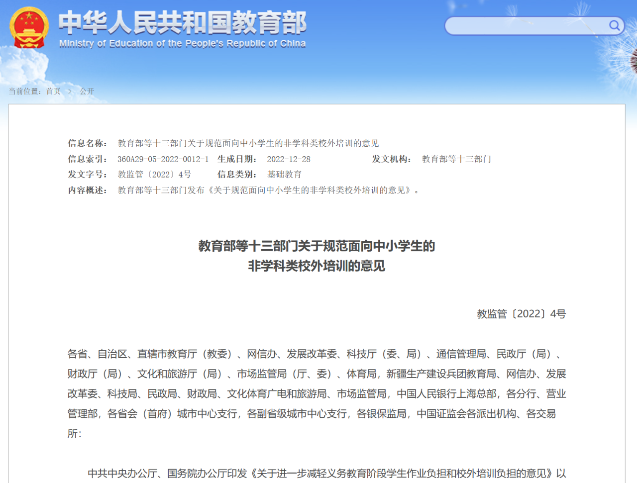 2021年7月,中共中央辦公廳、國務(wù)院辦公廳印發(fā)《關(guān)于進一步減輕義務(wù)教育階段學生作業(yè)負擔和校外培訓(xùn)負擔的意見》,部署實施“雙減”工作。一年多來,在全國各地及社會各方共同努力下,學科類培訓(xùn)治理取得階段性進展。在此基礎(chǔ)上,為回應(yīng)社會關(guān)切,加快解決非學科類培訓(xùn)出現(xiàn)的問題,全面規(guī)范非學科類培訓(xùn)行為,維護廣大學生及家長合法權(quán)益,近日,教育部等十三部門印發(fā)《關(guān)于規(guī)范面向中小學生的非學科類校外培訓(xùn)的意見》(以下簡稱《意見》),對非學科類校外培訓(xùn)治理作出系統(tǒng)部署。具體內(nèi)容跟甘小教一起來看——