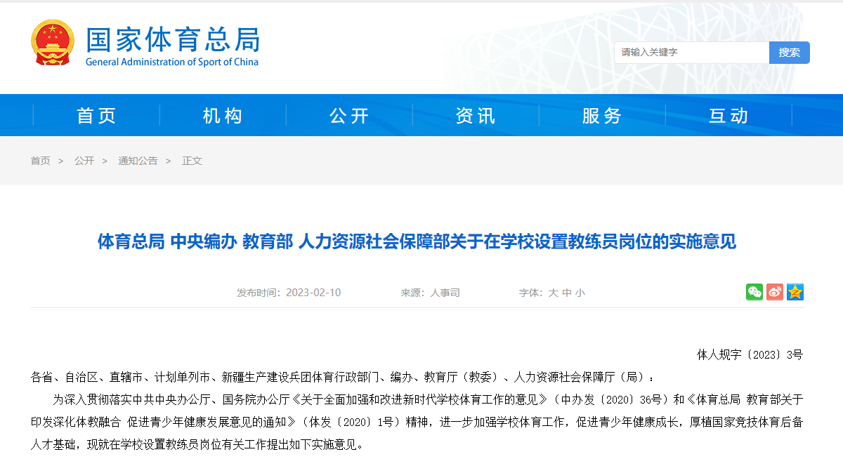 近日,國家體育總局、中央機(jī)構(gòu)編制委員會(huì)辦公室、教育部、人力資源和社會(huì)保障部等四部門聯(lián)合出臺(tái)了《關(guān)于在學(xué)校設(shè)置教練員崗位的實(shí)施意見》,部署學(xué)校教練員崗位設(shè)置工作。其中明確——