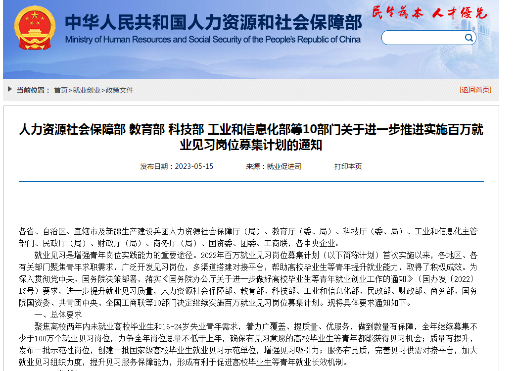 人力資源和社會保障部等10部門日前印發(fā)《關于進一步推進實施百萬就業(yè)見習崗位募集計劃的通知》,決定繼續(xù)實施百萬就業(yè)見習崗位募集計劃,幫助高校畢業(yè)生等青年提升就業(yè)能力。